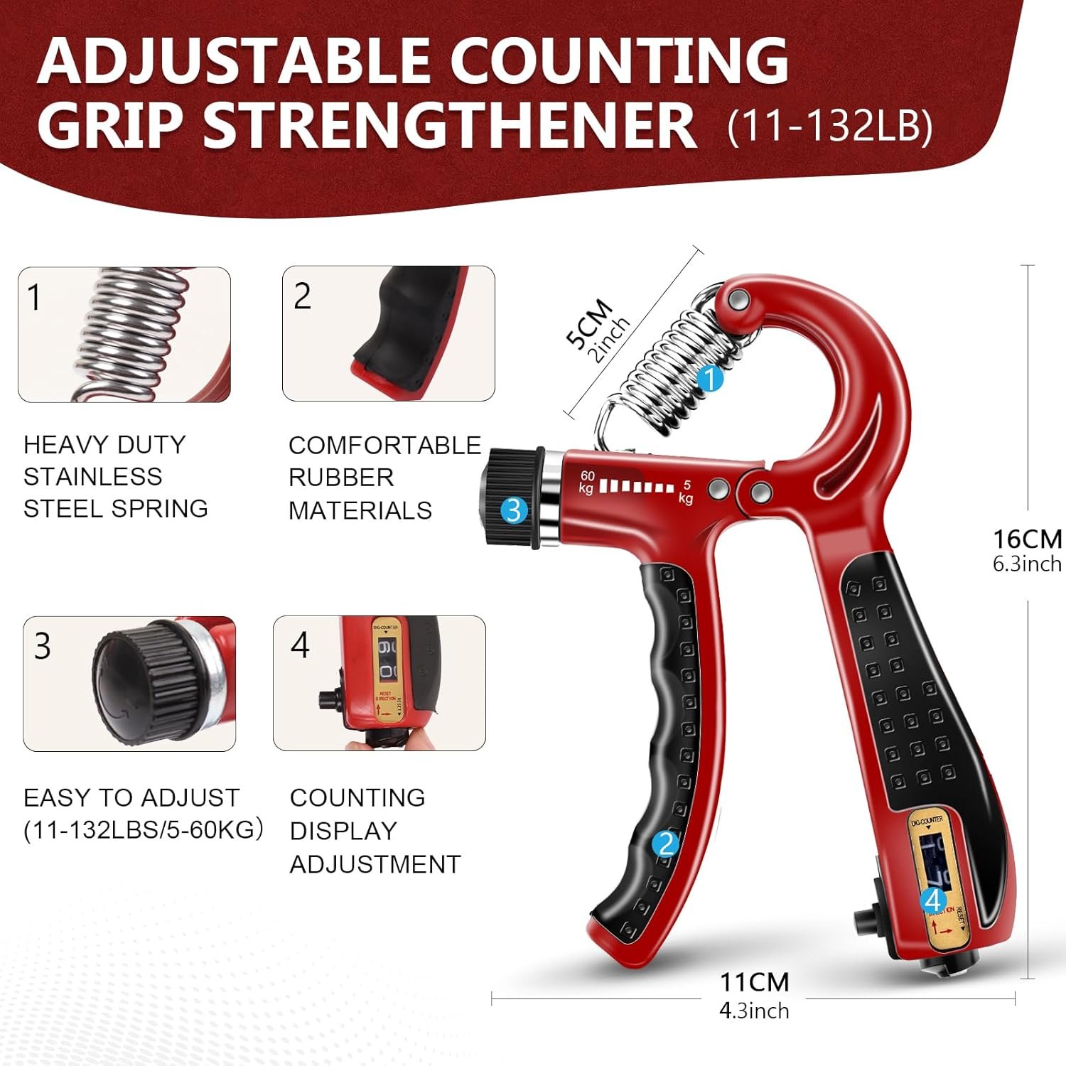 【Complete Hand Grip and Forearm Strengthener Kits 13 Pack】- The grip trainer set includes an Adjustable Smart Counting Hand Exerciser (11lbs to 132lbs.), Adjustable Finger Stretcher With 6 Level, Finger Exerciser(4lbs on each finger), 3 Stress Relief Ball (15,25,30lbs,), 3 Forearm Workout Ring (30,40,50lbs), 3 Finger Stretcher(6.6,8.8,11lbs)