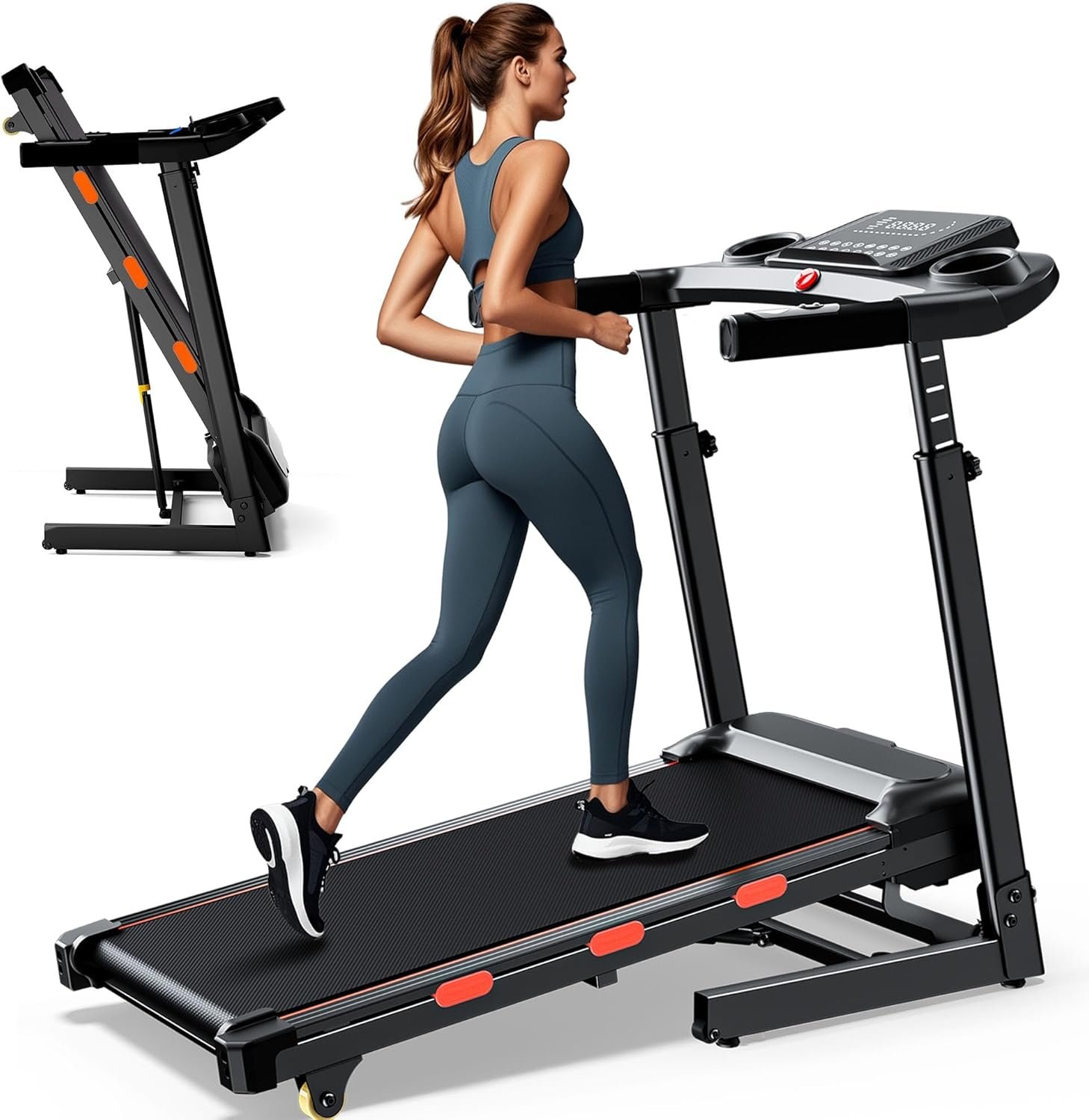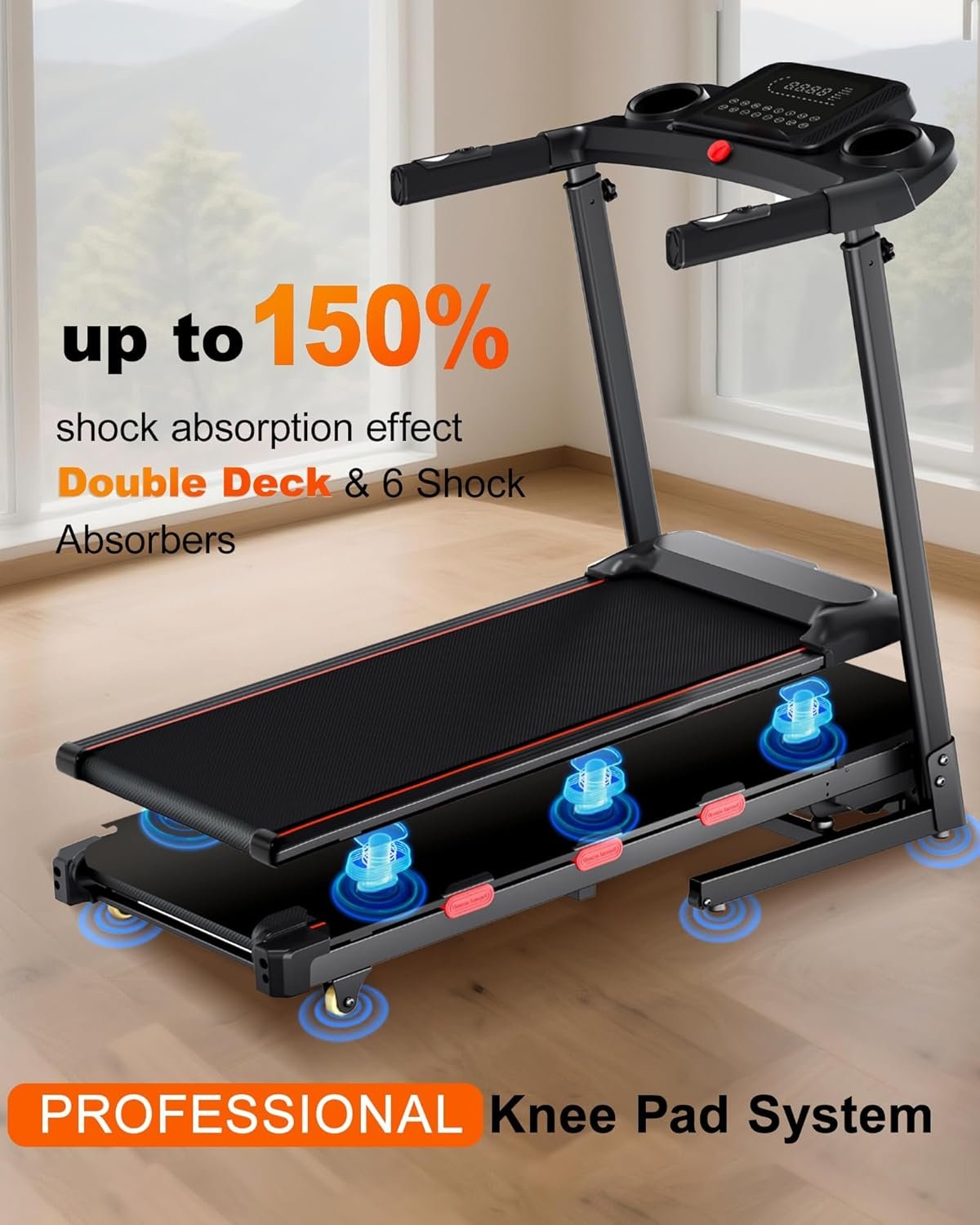 ***【Compact Design Fits Any Space】***This portable treadmill(Running Belt Size: 14.96*36.22 in) is designed for people under 5.6ft. It features built-in wheels that allow for easy storage in small apartments or confined spaces, such as a sofa, bed, or in a corner. Double Running Deck effectively reduces damage by 60% to the knees, muscles, and joints. Provide you with a more comfortable workout experience