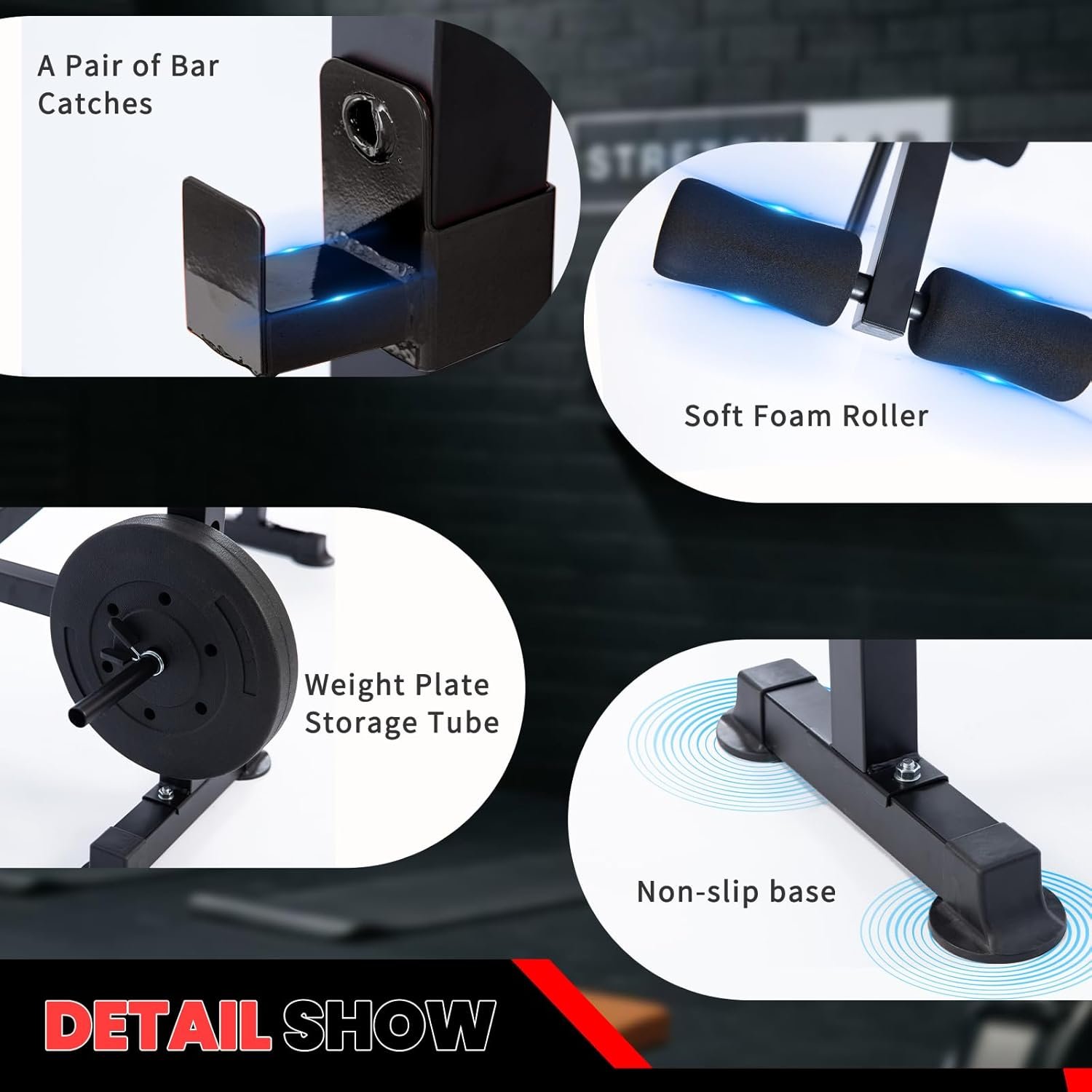 【Quick & Easy Adjustments】With multiple adjustment features, this bench allows you to modify the backrest angle to four different positions: incline, decline, and flat. The adjustable weight rest offers four height options, enabling you to quickly adapt the barbell height to your needs and workout goals. We strive to provide you with the most comfortable experience.