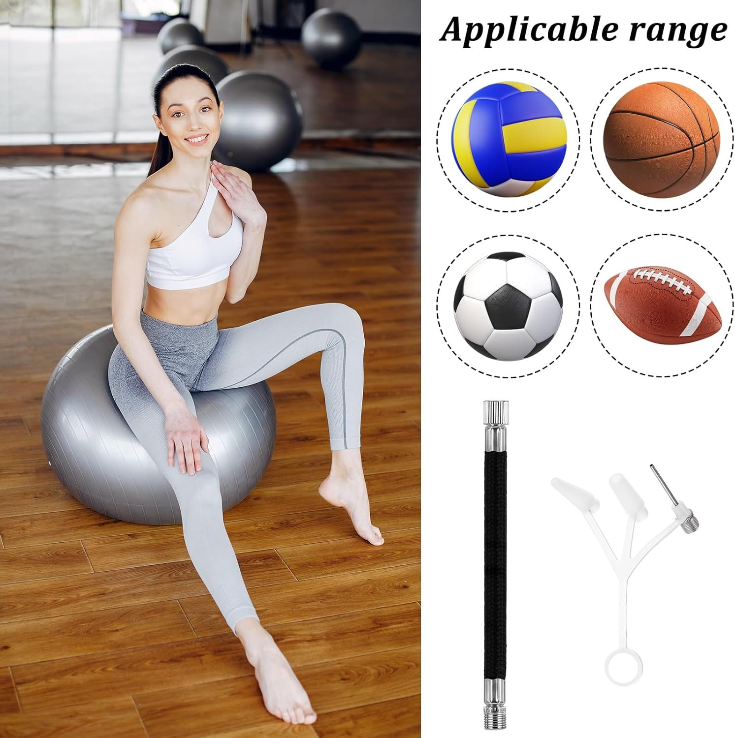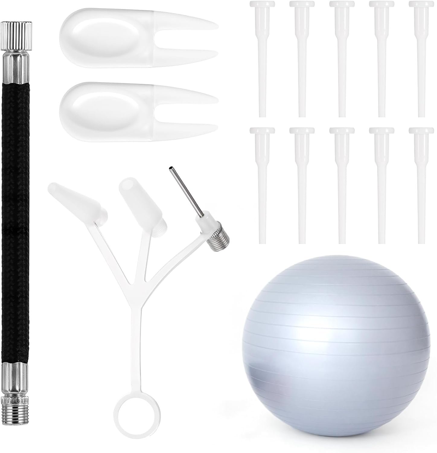 Product Combination: The exercise ball plug replacement kit contains a white universal air needle (including ball needle), a black extension tube, two air pull forks and ten 5 cm/ 2 inches sheep horn ball needles