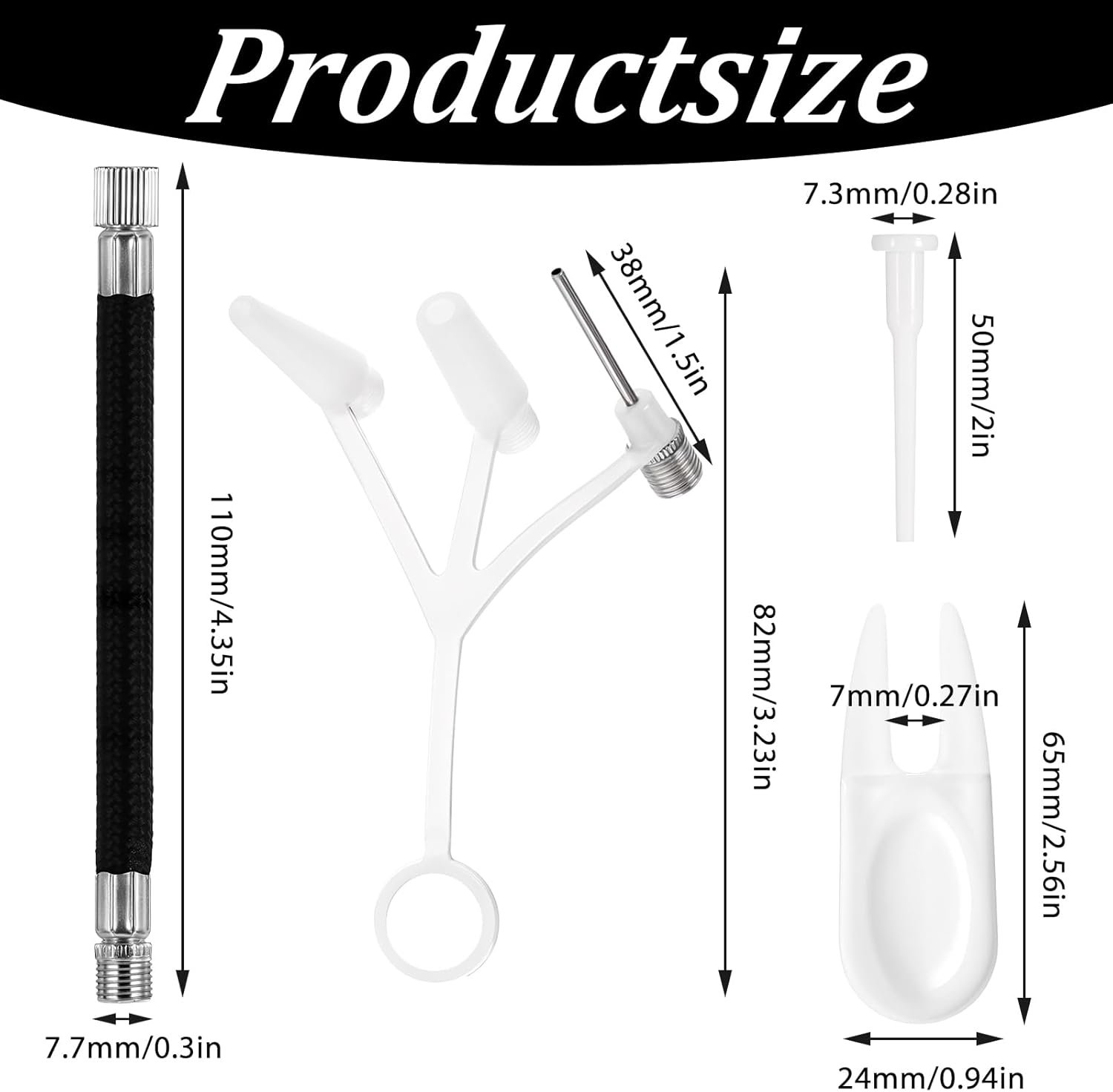 Packing list: 1X white universal air needle (including ball needle) + 1X black extension tube + 2X air fork + 10X5cm sheep horn ball needle