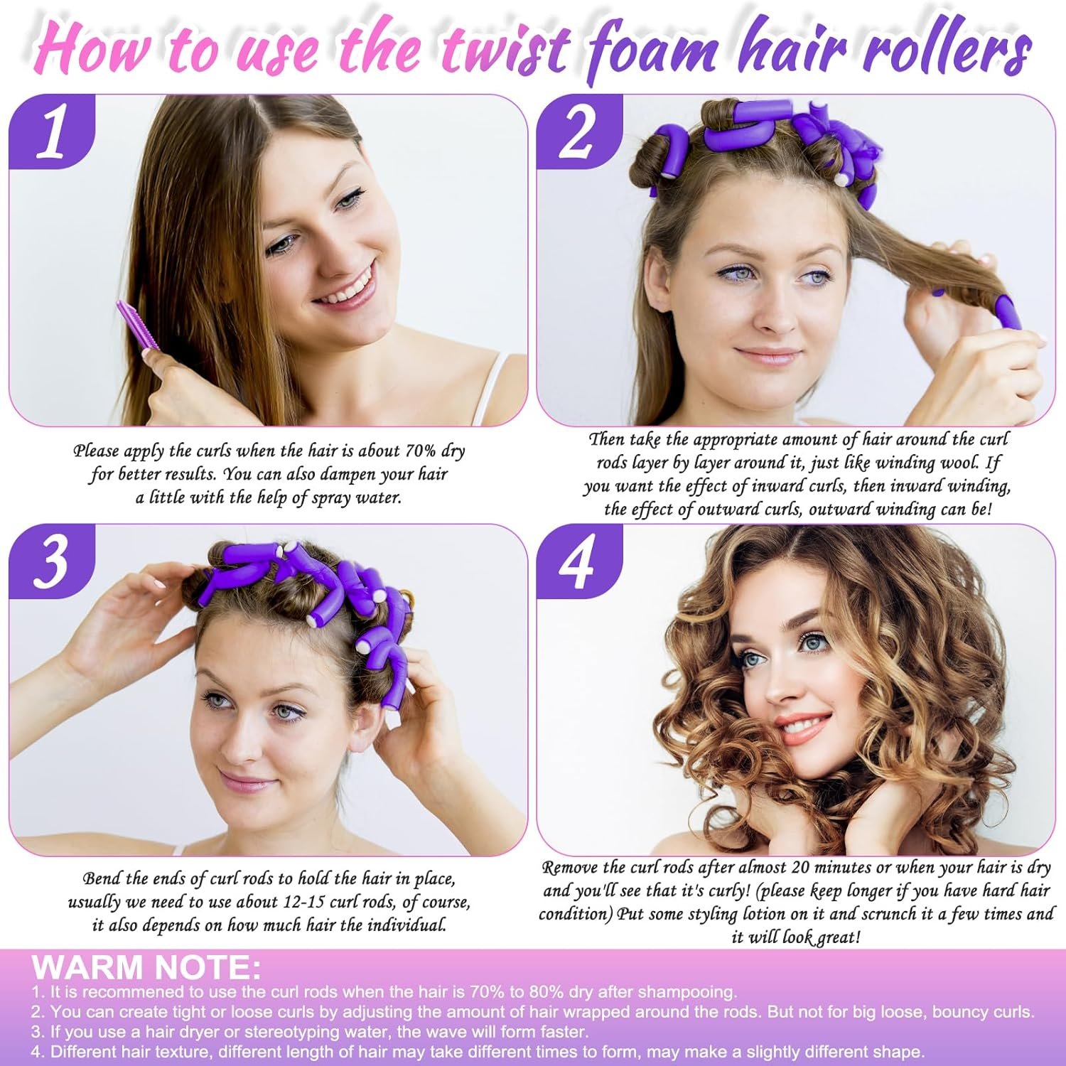 Easy to Use: Use a comb gently brush a section of 70%-90% dry hair, put the curling rods in the hair end, and roll curling rods up towards your scalp, then bend the ends of this flexi rods to hold the hair in place, use a blower to dry your hair for 10 minutes, or wait for up to 20 minutes of natural drying(please keep longer if you have hard hair condition), then you can get charming curly hair. Adjusting the direction of starting rolling hair can create various hair waves. These foam curlers for hair are Not recommended to sleep in, and not for people with very fine thin hair