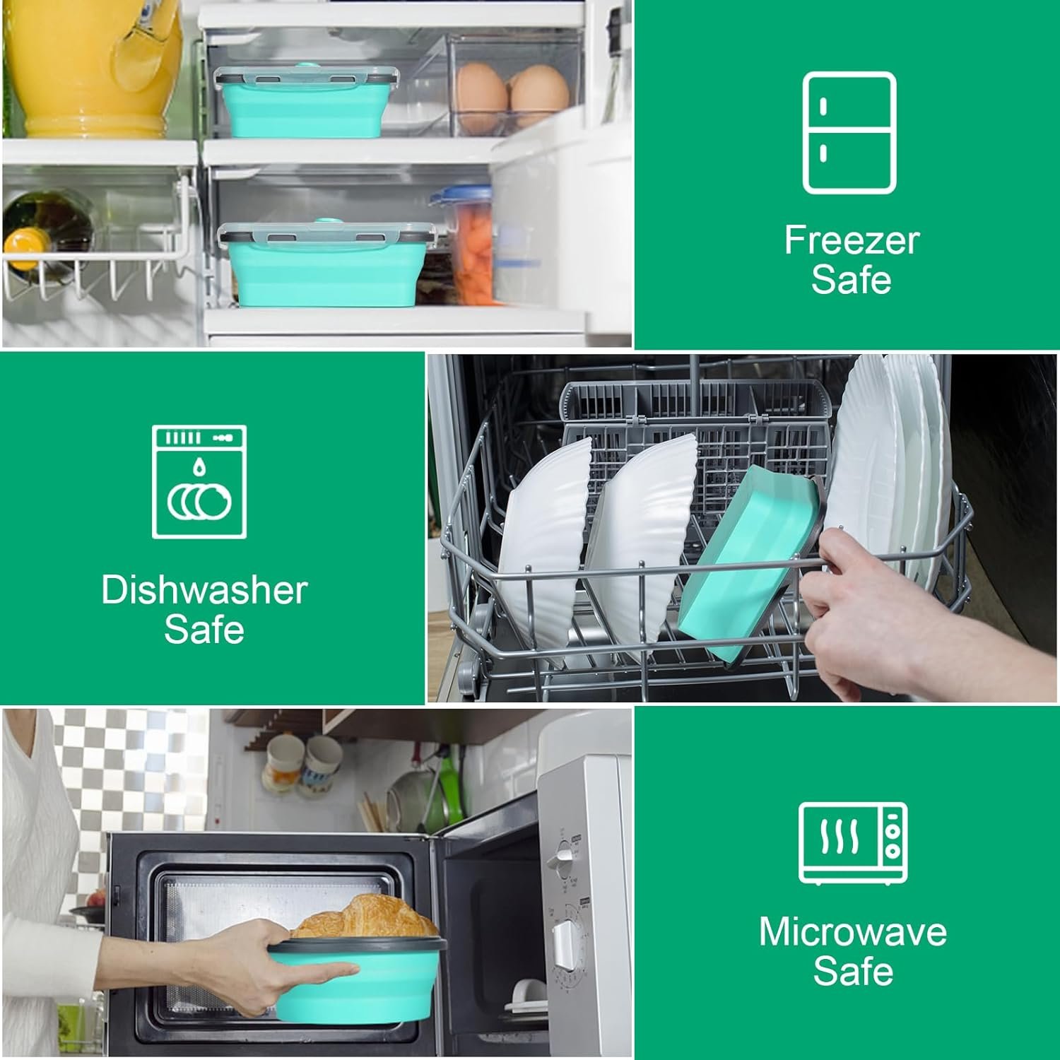 Safe and Sturdy: these collapsible storage containers are made of food-grade silicone. temperature is rank from -4°F to 428°F (-20°C to 220°C) . Not only are they microwave and freezer safe, but also dishwasher safe. PLEASE do not heat the lids in the microwave oven.