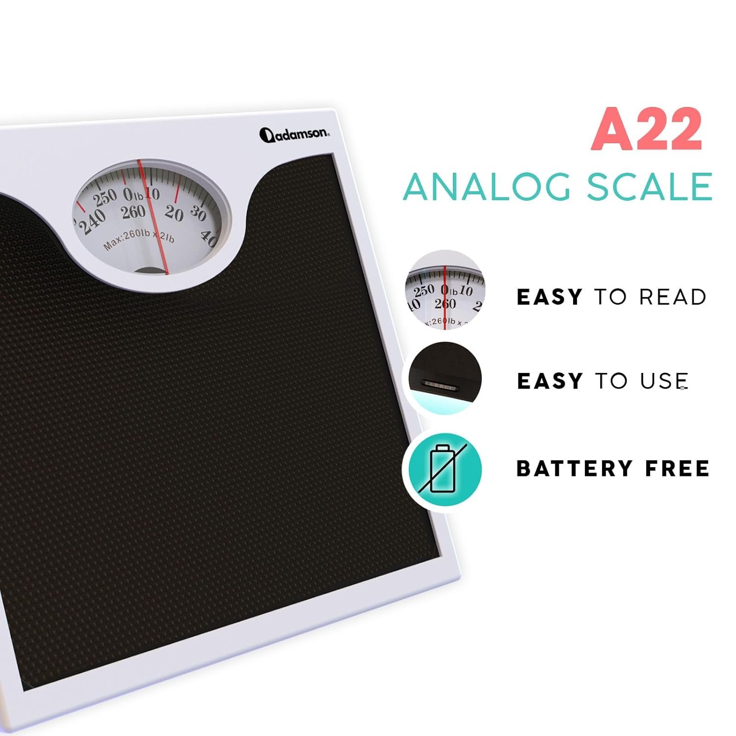 Adamson A22 Bathroom Scale for Body Weight – Up to 260 LB – Anti-Skid Rubber Surface – Analog