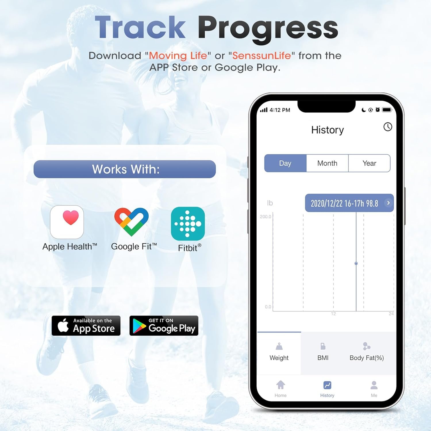 【Download APP & Easy Monitoring】 “Moving Life” or “SenssunLife” (Requires iOS 8.0 or above). Download “Mobile Life” or “SenssunLife” from Google Play (Requires Android 4.3 or higher). Weight, body fat and other data can be easily detected to help you record changes.