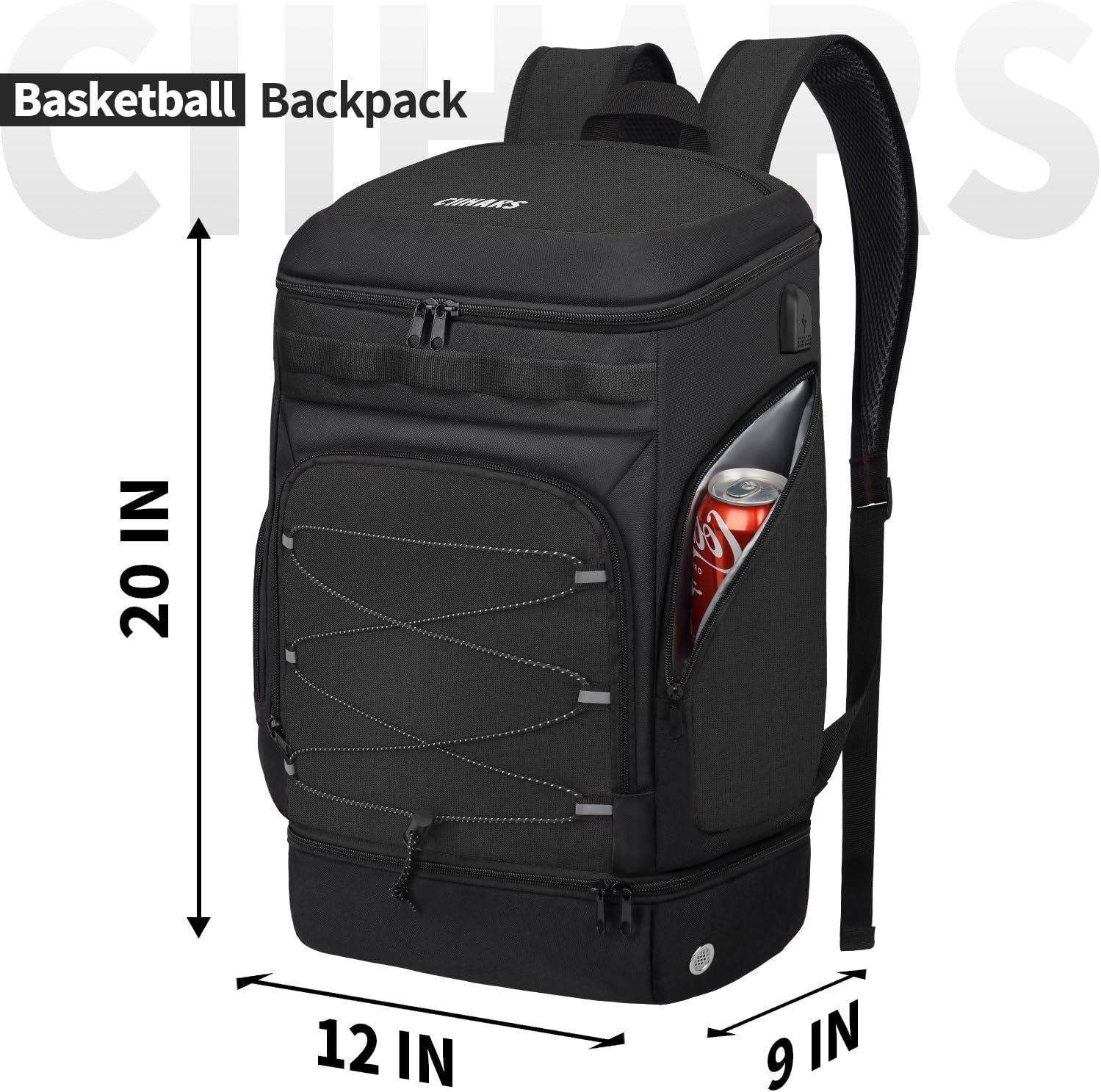 Basketball backpack have a seperated shoes compartment with vents, to keep your bag clean and ventilate. Above the shoes compartment is the individual ball compartment. At the top of basketball bag backpack, a pocket to protect your phone from scratch. A large capacity main pocket to fit all your basketball accessories gear, basketball stuff, basketball training equipment.