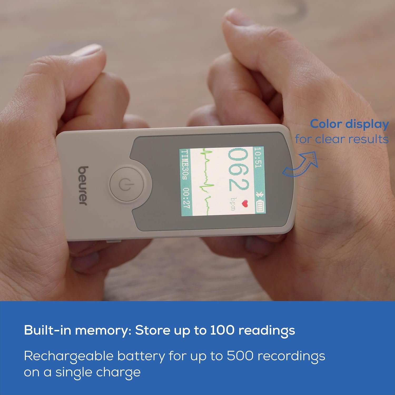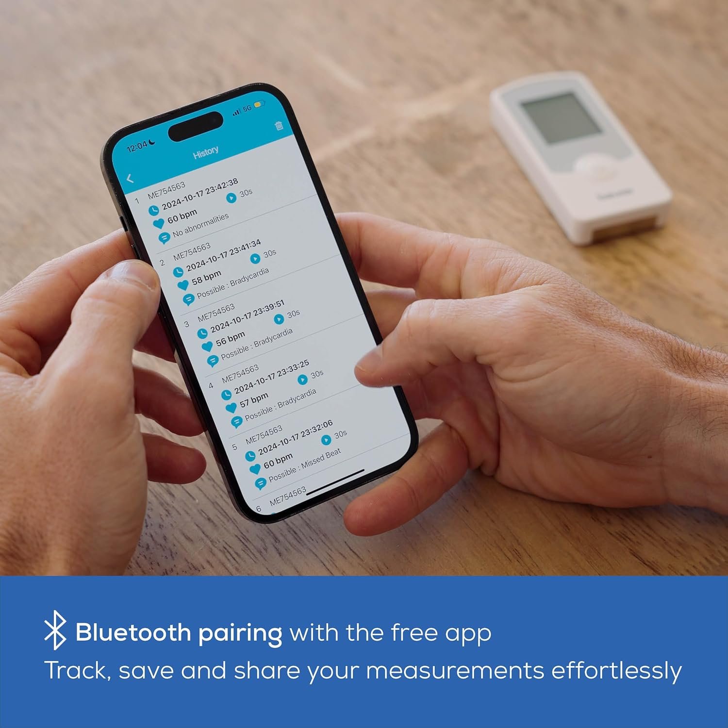 OPTIONAL APP: Save 100 readings locally to the ME75 device or unlimited through the mini ECG app via Bluetooth, the free app is for optional health tracking and heart monitoring, not required for use