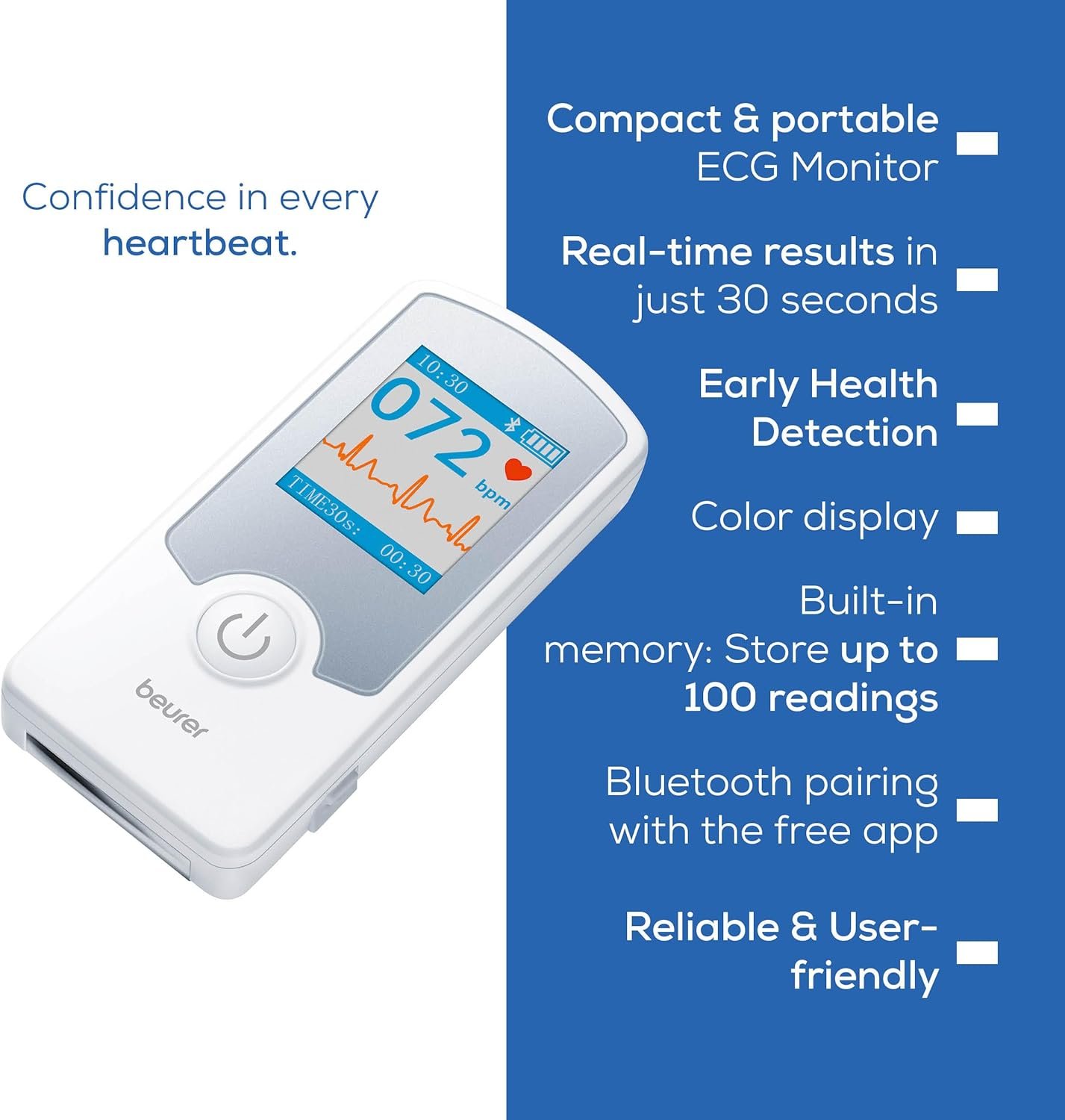 ACCURATE & RELIABLE: German engineered for precision, this 3-lead EKG monitor is FDA-cleared to measure your heart rhythm in under 30 seconds with real-time results on the bright, color display