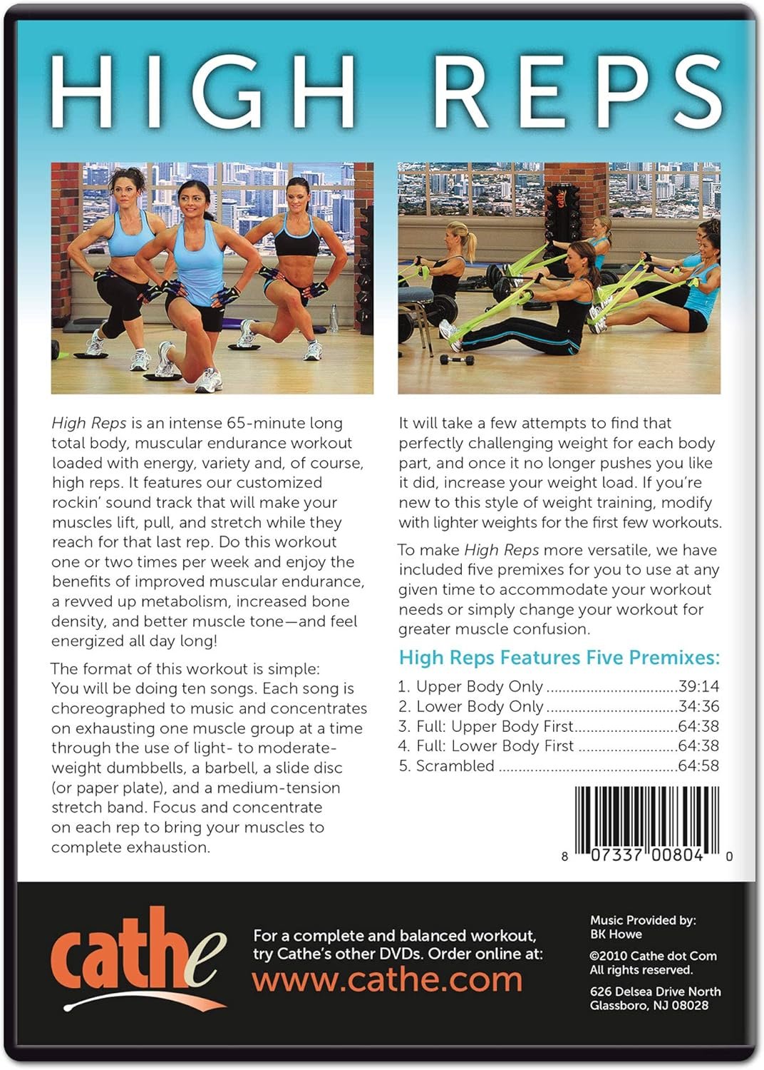 Includes High Rep Premixes – Includes 5 additional Cathe workout Premixes with various time options to fit your busy schedule and so you will never get bored