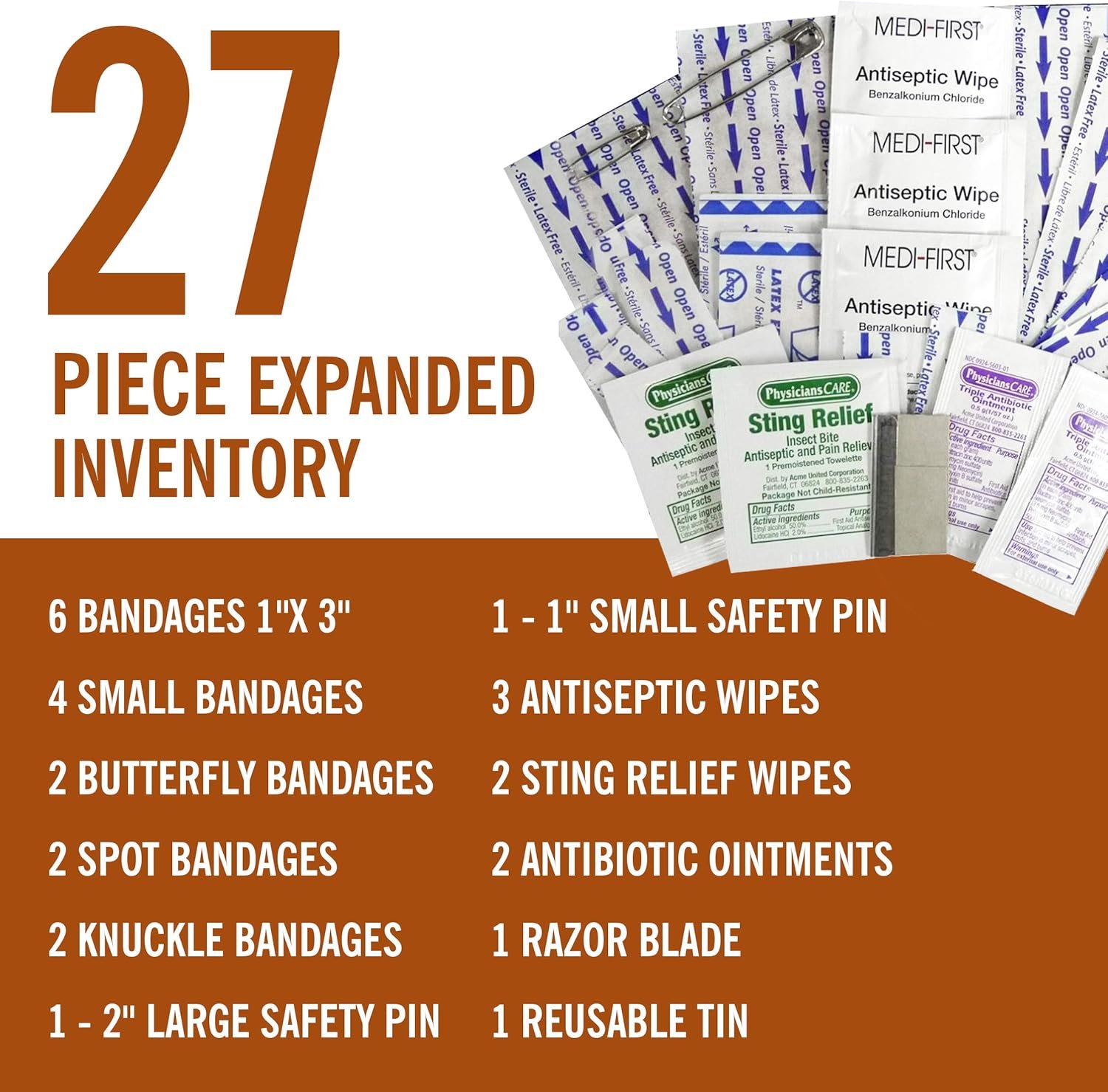 This product is a good deal when on sale. The tin is attractive but allows me to have a small first aid kit in my work bag for minor cuts.It includes quite a lot.CAUTION! NOT TSA SAFE WITH BLADE!Beware this is not TSA safe with a razor blade. Remove the blade and pins for airline travel.Everything is wrapped safely and the kit is in date. I had room to add more bandages and some packages of triple antibiotic ointment.I recommend this to anyone needing a portable solution for minor cuts or abrasions. It even included some ointment for burns or cuts.