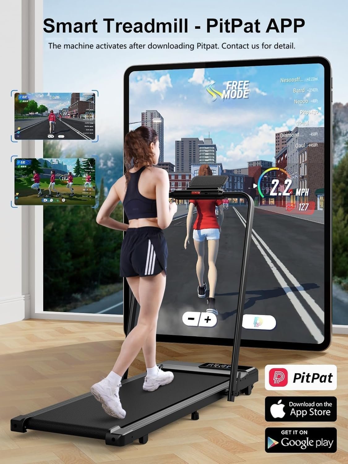 SMART APP & LED DISPLAY: The mini treadmill features a smart APP for recording exercise data and offers virtual simulations, multiplayer connectivity, team races and rewards, enhancing workouts with interactive features and friendly competition. Even without using the APP, the small treadmill’s LED display can track real-time exercise metrics such as time, speed, distance, and calories burned