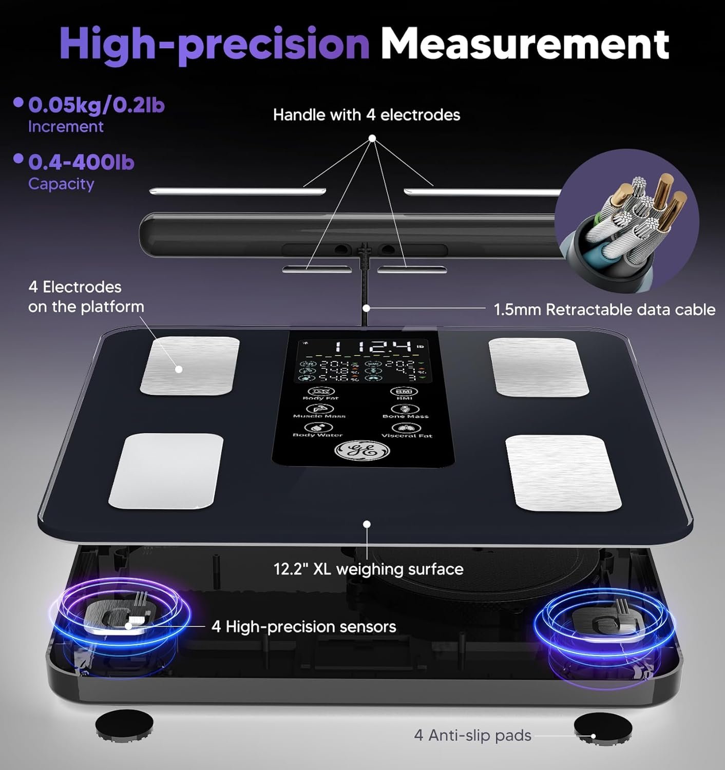 COMPREHENSIVE AND HIGHLY ACCURATE: The GE smart scale utilizes 8-electrode dual-frequency and segmental BIA technology, segmenting the body into five sections(four limbs and torso) for precise measurements to provide you with more accurate and comprehensive body composition data