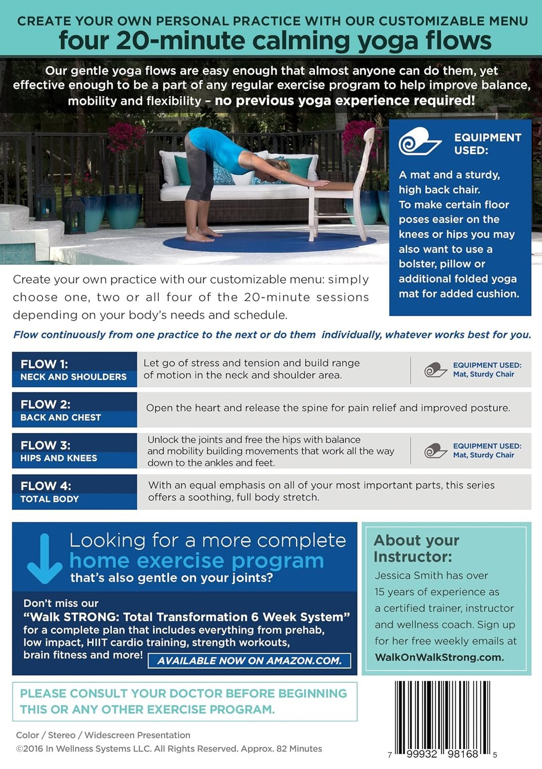 UPDATE: 1 year later this is still a favorite dvd. I reach for it often. I may not use the chair anymore but the video offers that option. Still LOVE this as a great flow, good pace, great cues, awesome stretch.Original review: I have been doing yoga for 3 weeks . I have struggled to find a practice that would walk me thoroughly and gently (I’m pretty inflexible!) through a complete practice. This is it! I did all 4 20 minute sessions one after the other. They flow beautifully and the DVD gives the option to do all at once as well as any one individually. I like the all at once option so I don’t have to stop, put on my glasses and fiddle with it. It is a really good practice that left me stretched and tired. I cannot thank you enough. I will wear this out in my quest to complete it with the hardest modifications (currently on the easy ones!) so I can move on to some more challenging yoga. The breath is also queued very well! I see this in my life for a year or more. Yay!!!!!