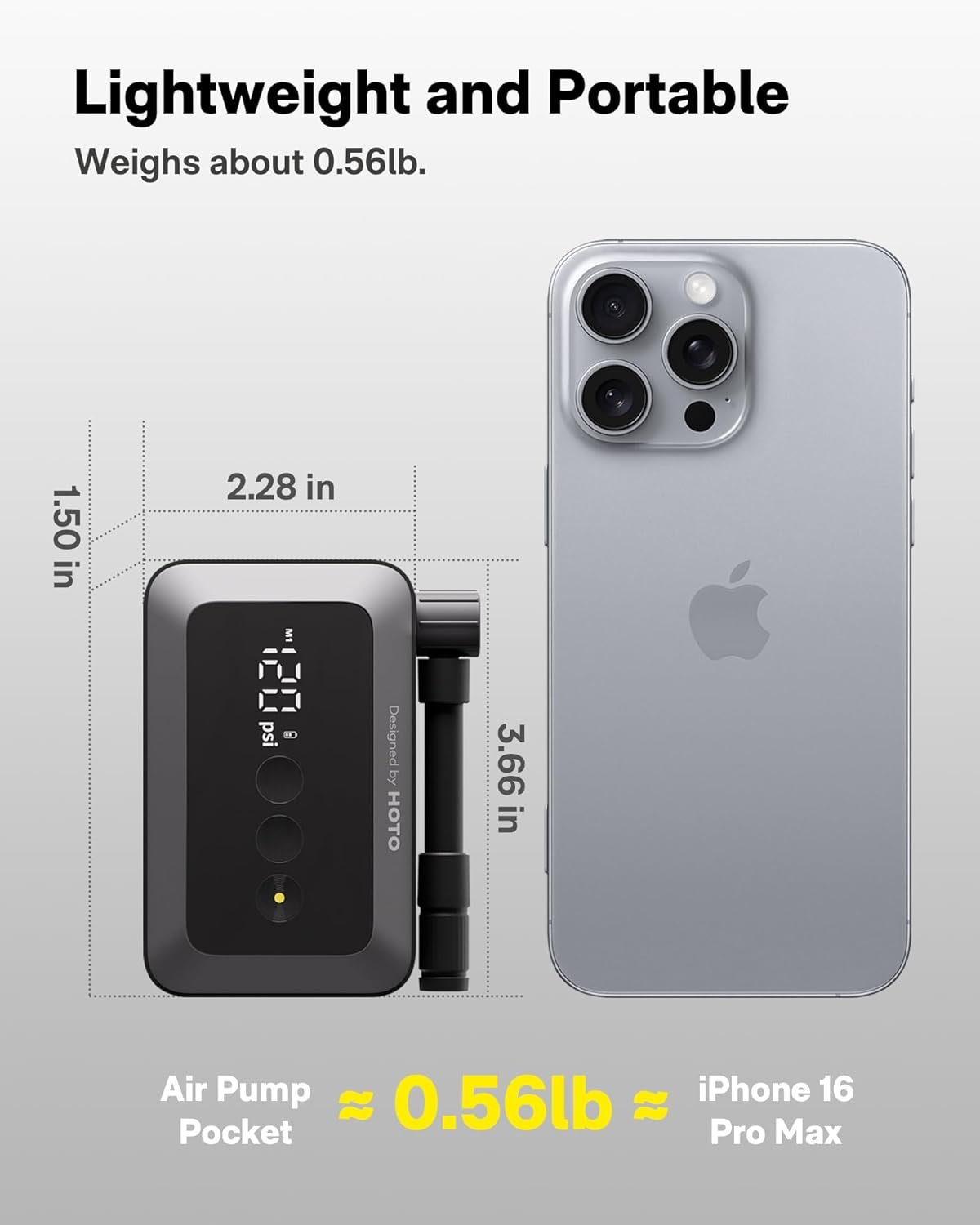 POCKET-SIZED BUT POWERFUL: Measuring just 3.66 x 2.28 x 1.5 in and weighing 0.56 lb, the HOTO bicycle pump is incredibly lightweight and portable. It’s perfect for cyclists and outdoor enthusiasts to carry on their adventures. Built-in 2000 mAh high-capacity lithium batteries and a brushless motor, it can inflate eight flat tires or eighteen low-pressure tires after fully charged