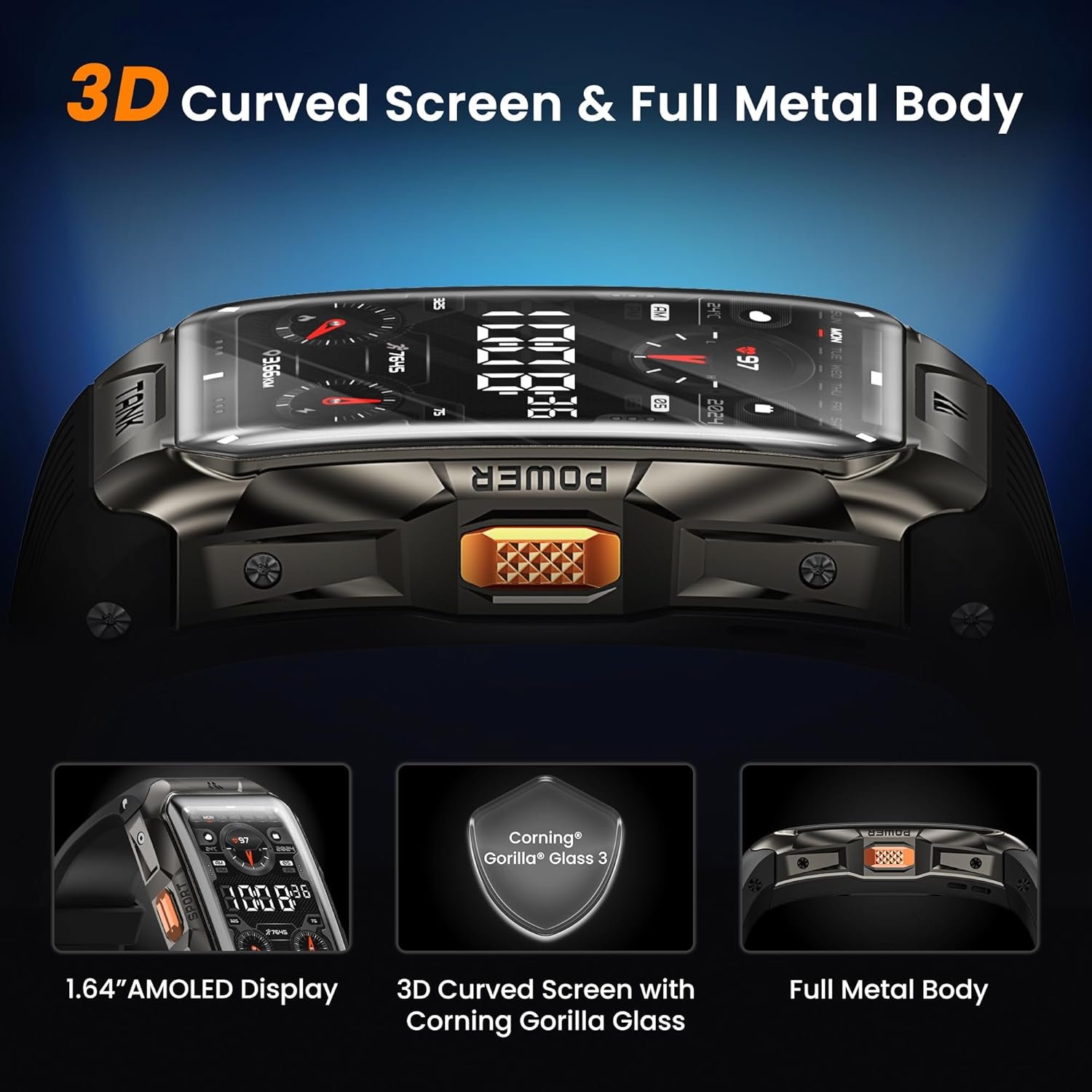 Military-Grade Designed: The KOSPET X2 smartwatch features 1.64-inch 3rd AMOLED always-on Display with 3D curved glass, which is thick enough to handle a range of screen-breaking behaviors. The rugged smart watch has a fully stainless steel unibody, passed 15 Military Tests(MIL-STD-810H) and 28 Reliable Internal Tests, Including salt spray, rain, impact, etc.