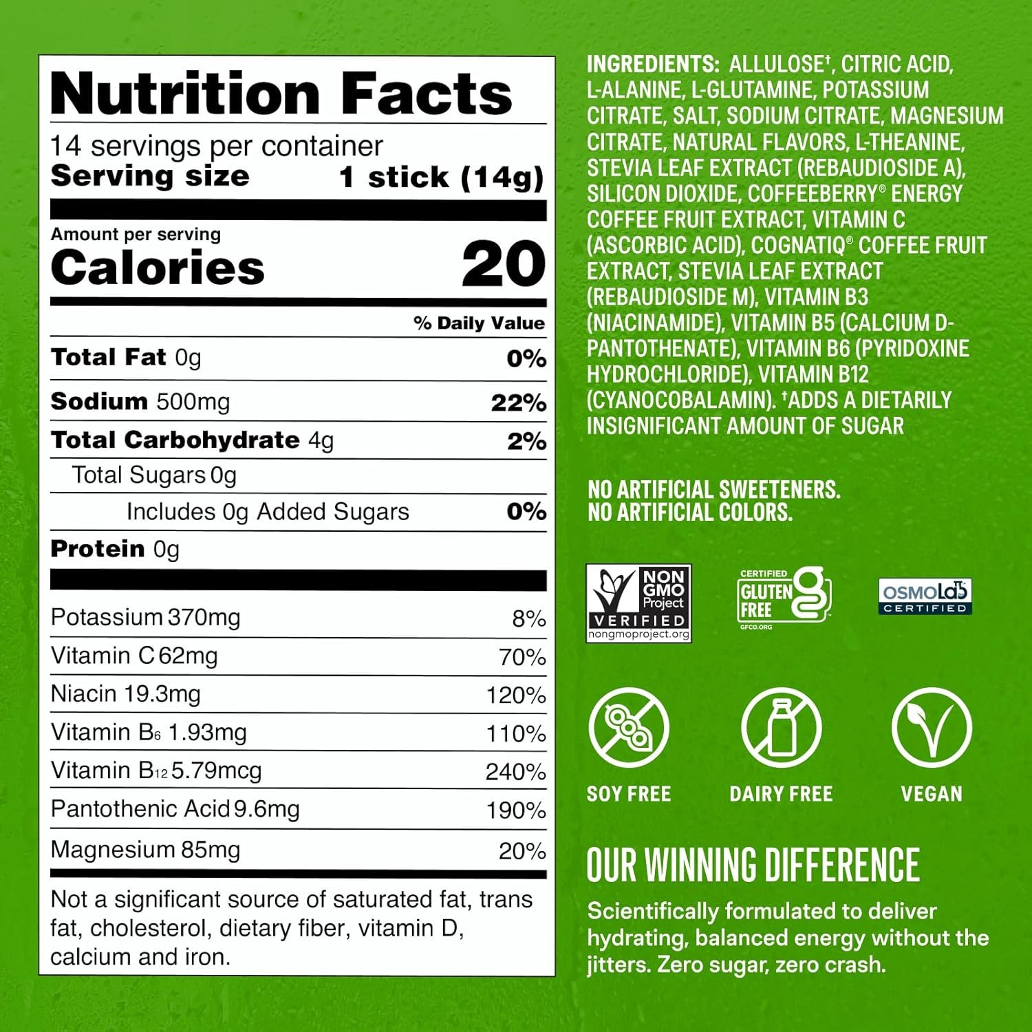 BALANCED, JITTER-FREE ENERGY: Our scientifically tested formula combines 100mg natural caffeine with L-theanine for a balanced lift. Vitamins B3, B5, B6 and B12 support cellular energy. It’s zero sugar, zero crash, and contains no artificial sweeteners.