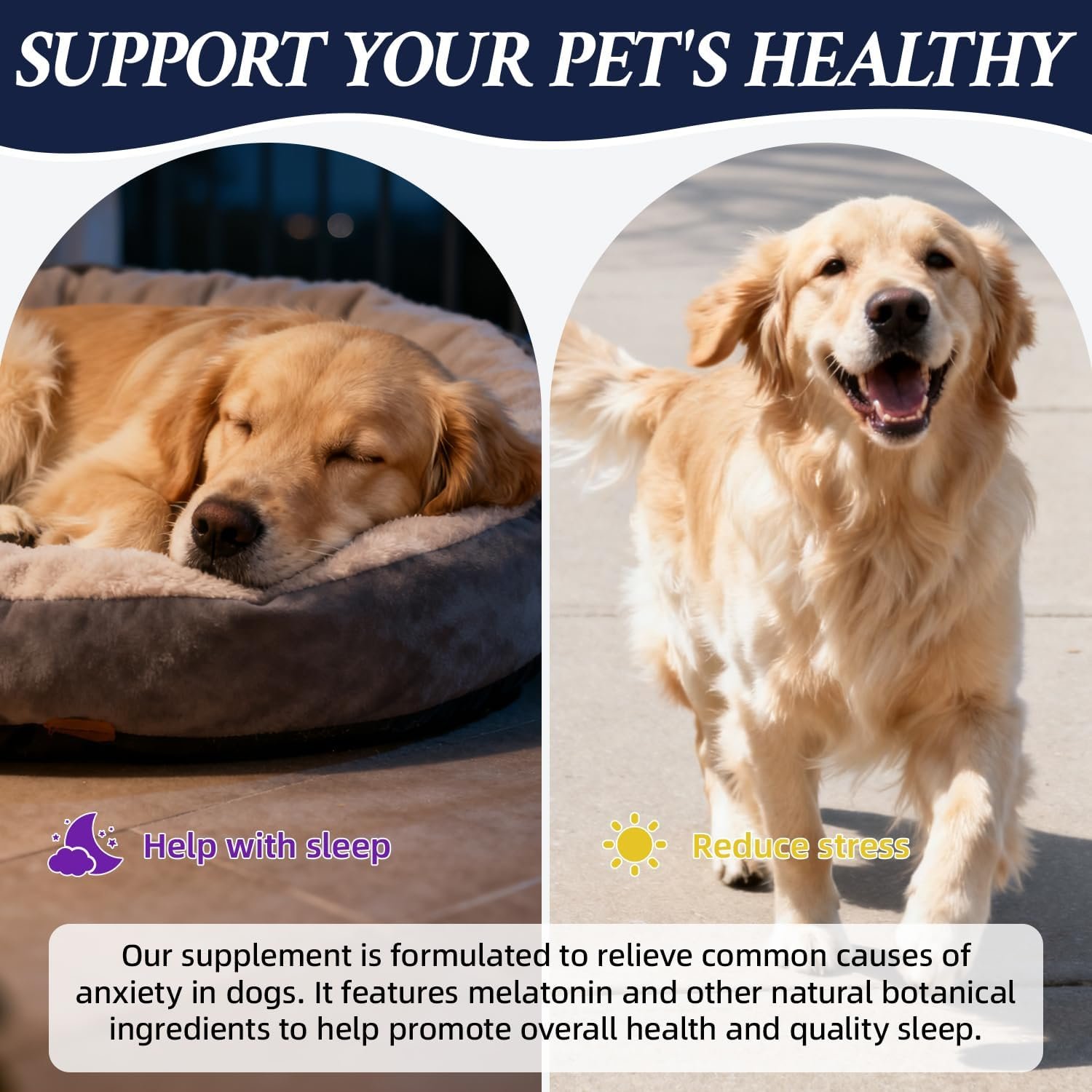 PROMOTES HEALTHY SLEEP PATTERNS: Dog melatonin helps regulate your pet’s natural sleep-wake cycle, encouraging faster relaxation at night and deeper, more restful sleep. Perfect for dogs struggling with disrupted sleep from loud noises or environmental changes, this sleep support ensures your pet wakes up refreshed and well-rested.