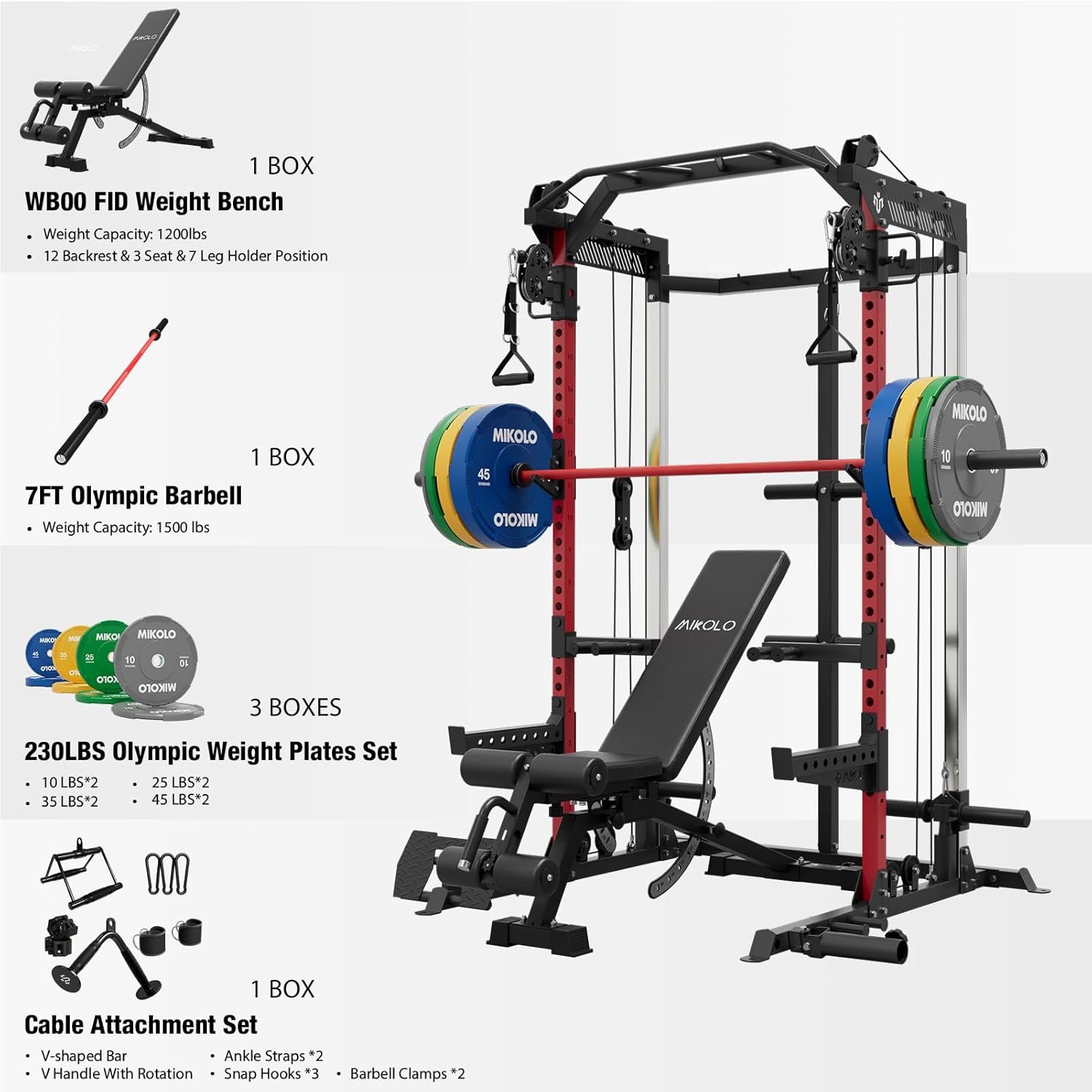 Specification: Mikolo Power Cage, 2000LB Power Rack with Independent Dual Pulley System, Multi-Function Home Gym