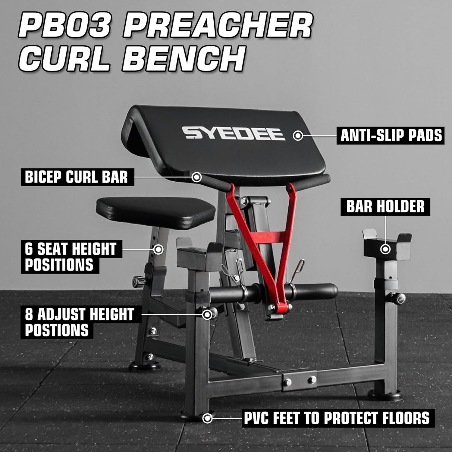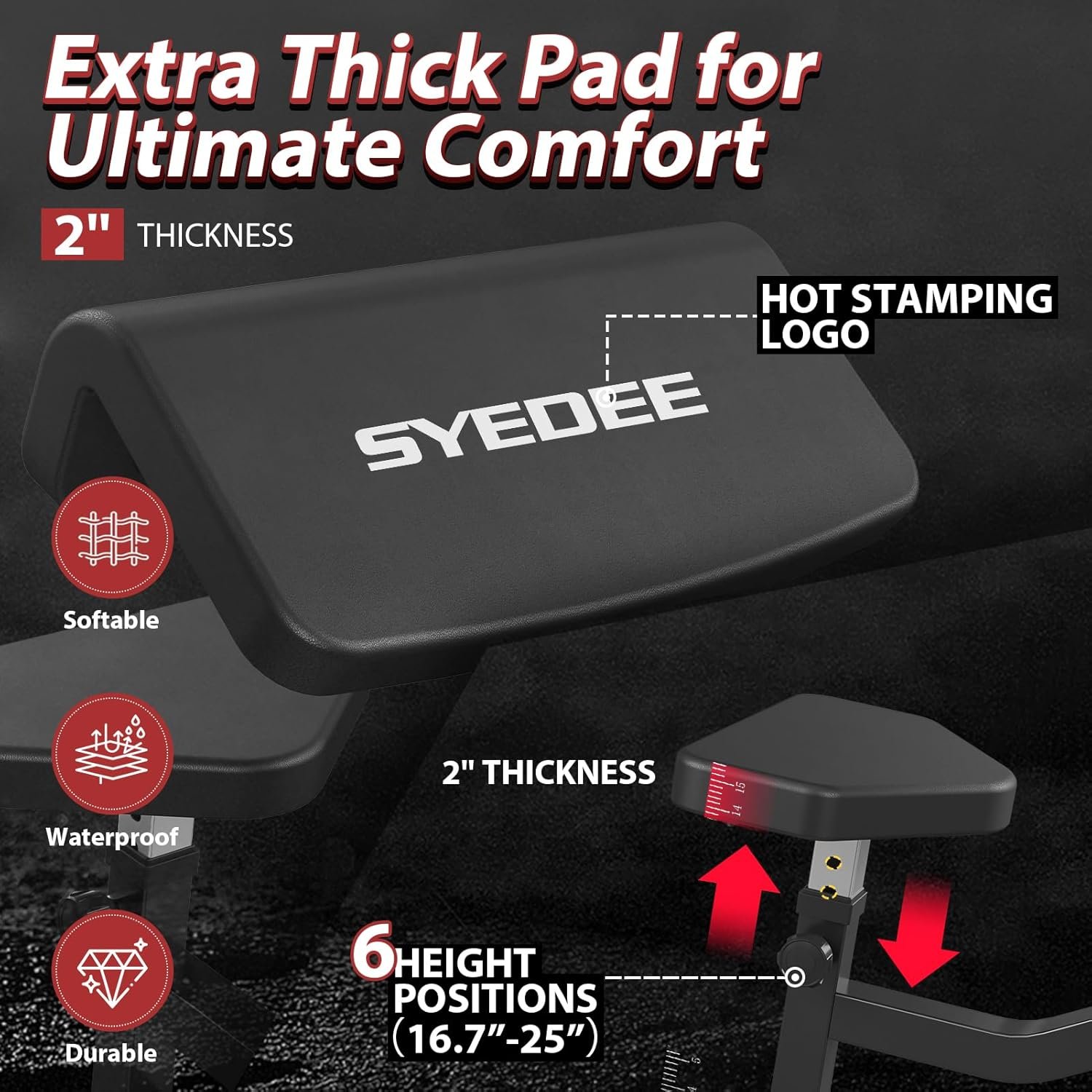【Adjustable Features】: Easily customize the seat and preacher pad positions.Wide range of adjustment options, making it suitable for almost any body size.Rack with 8 height settings, with rubberized shelves for free training with barbells or dumbbells.