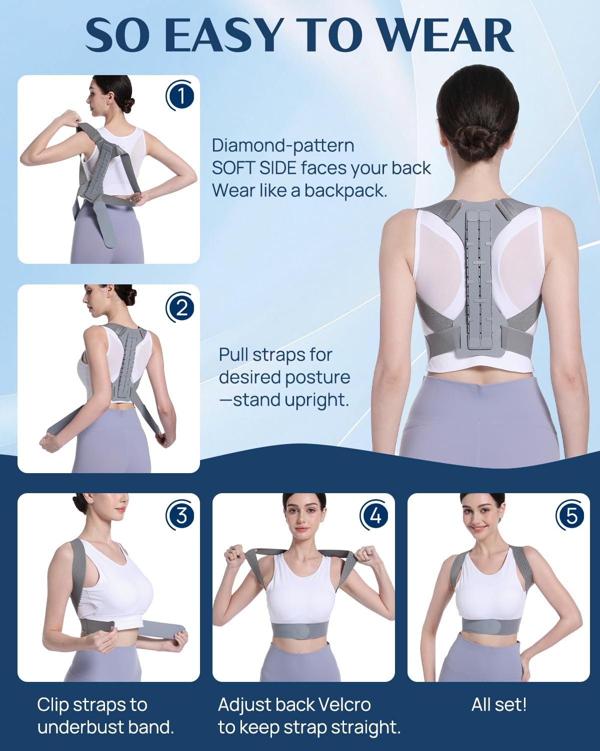 Adjust straps to feel like a supportive hug: 1.Gentle guidance upright,2.Not too tight (restricts breathing) ,Not too loose (no effect),3.Find your perfect fit.