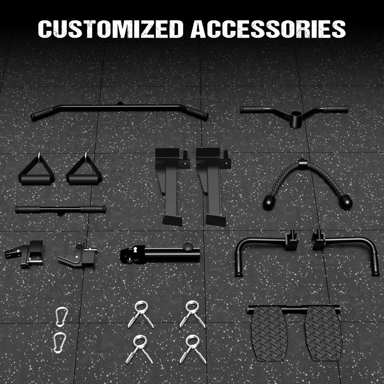 【Fully Equipped & Versatile】Equipped with a full set of professional accessories, JELENS provides you with a complete and diverse home fitness experience. This includes:lat pull-down bar*1, cable bar*1, T-bar*1, pull down bar*1, tricep rope*1, J-hooks*2, cable handle x 2, weight storage pins x 4, 360° landmine*1, foot board*1, counterweight racks with clamps*4. Meanwhile, all accessories can be quickly disassembled and installed, allowing you to switch sports modes more conveniently and quickly.