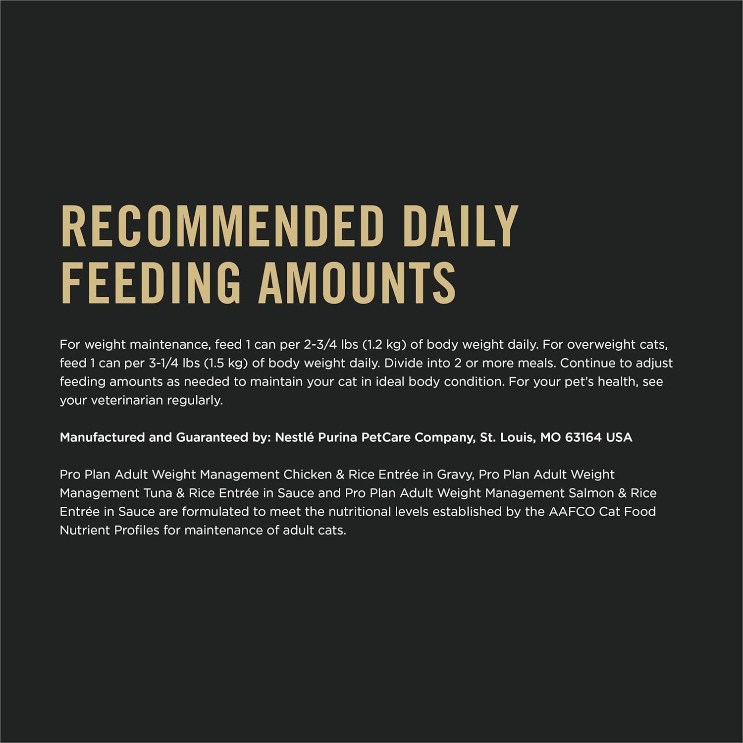 Adult Weight Management Chicken & Rice Entrée: For weight maintenance, feed 1 can per 2-3/4 lbs (1.2 kg) of body weight daily. For overweight cats, feed 1 can per 3-1/4 lbs (1.5 kg) of body weight daily. Divide into 2 or more meals. Continue to adjust feeding amounts as needed to maintain your cat in ideal body condition. For your pet’s health, see your veterinarian regularly.; Adult Weight Management Tuna & Rice Entrée: For weight maintenance, feed 1 can per 2-3/4 lbs (1.2 kg) of body weight daily. For overweight cats, feed 1 can per 3-1/4 lbs (1.5 kg) of body weight daily. Divide into 2 or more meals. Continue to adjust feeding amounts as needed to maintain your cat in ideal body condition. For your pet’s health, see your veterinarian regularly. ; Adult Weight Management Salmon & Rice Entrée: For weight maintenance, feed 1 can per 2-3/4 lbs (1.2 kg) of body weight daily. For overweight cats, feed 1 can per 3-1/4 lbs (1.5 kg) of body weight daily. Divide into 2 or more meals. Continue to adjust feeding amounts as needed to maintain your cat in ideal body condition. For your pet’s health, see your veterinarian regularly.