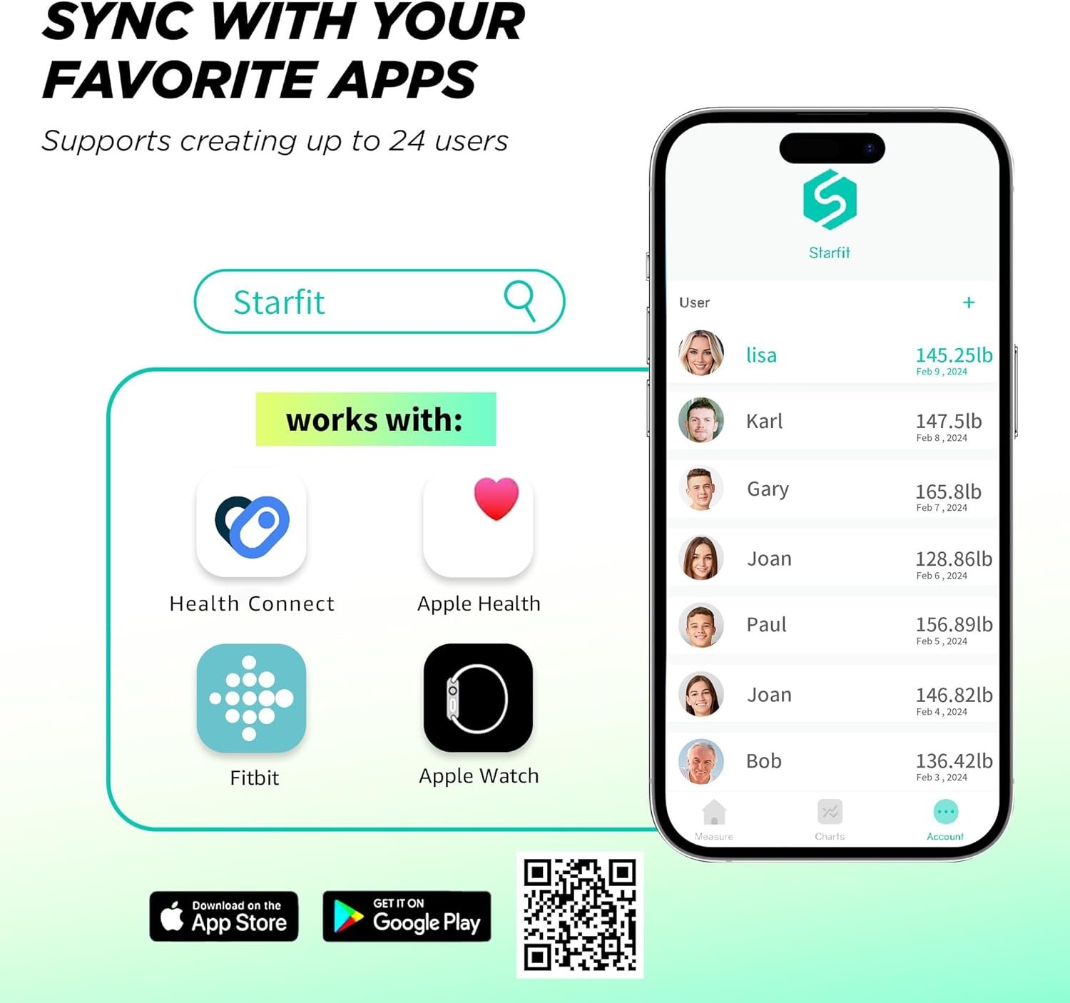 One Scale Unlimited Users: Starfit App allows you to create unlimited profiles 24 Users for your family and friends with only one smart scale. Starfit App also can easily sync with other fitness Apps like Apple Health, Health connect , Fitbit and so on.