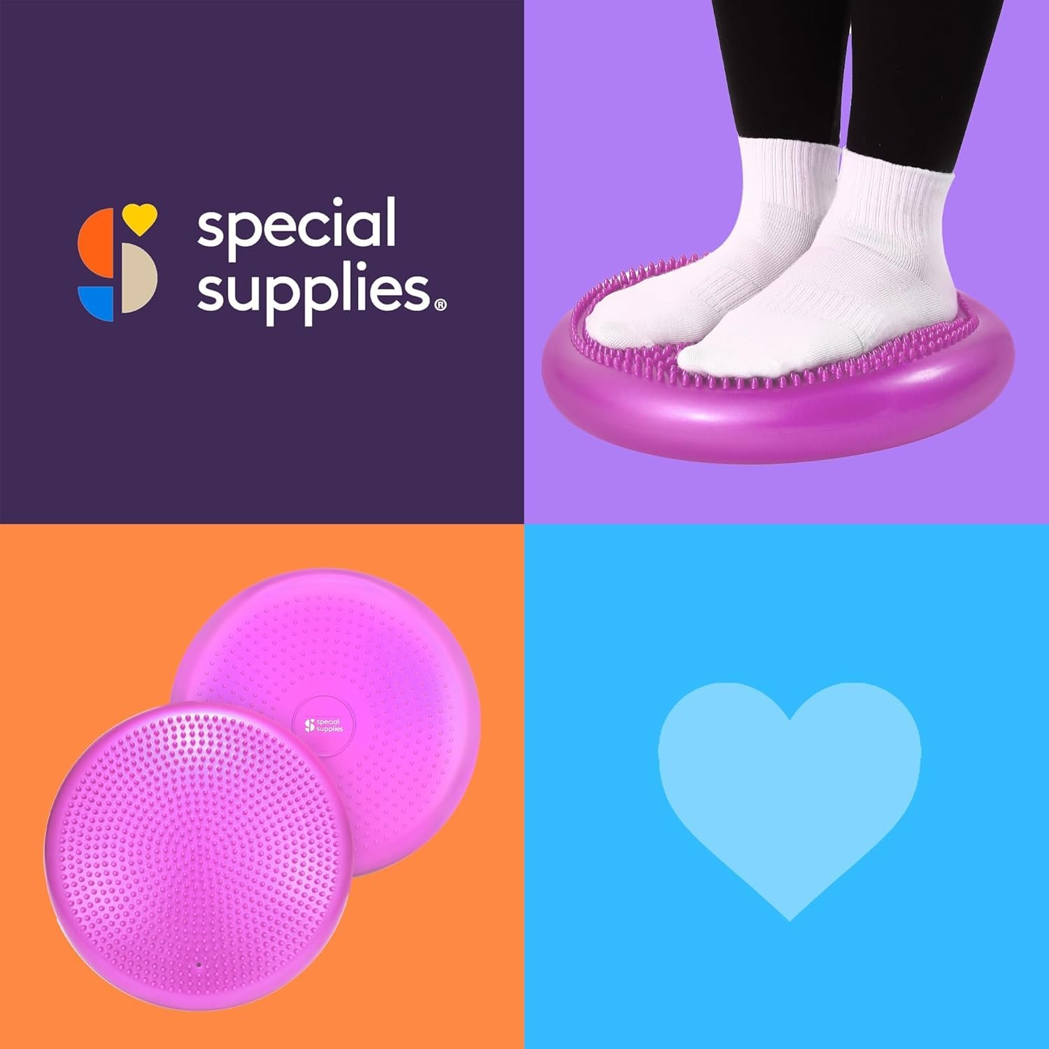 When it comes to building core strength, enhancing leg stability, or even increasing coordination you want workout equipment that’s easy to use, but also provides real versatility when it comes to fitness or recovery. We developed the Special Supplies Stability Cushion as a multipurpose wobble pad that helps you do just that. Designed to be both a sensory experience and active piece of workout equipment this balance can be used for balancing standing up or stimulating your body when seated. Featuring hundreds of soft, tactile spikes across the surface and a softly molded ring pattern to enhance grip this unique balance pad helps kids, teens, and adults gain strength, improve stability, and even recover after injuries.