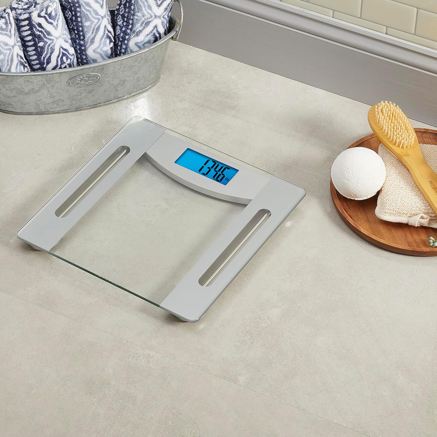 SLEEK DESIGN: This scale features an elegant 11.8″ x 11.8″ platform crafted from 6mm clear glass with a metallic silver finish, blending seamlessly into any bathroom décor.