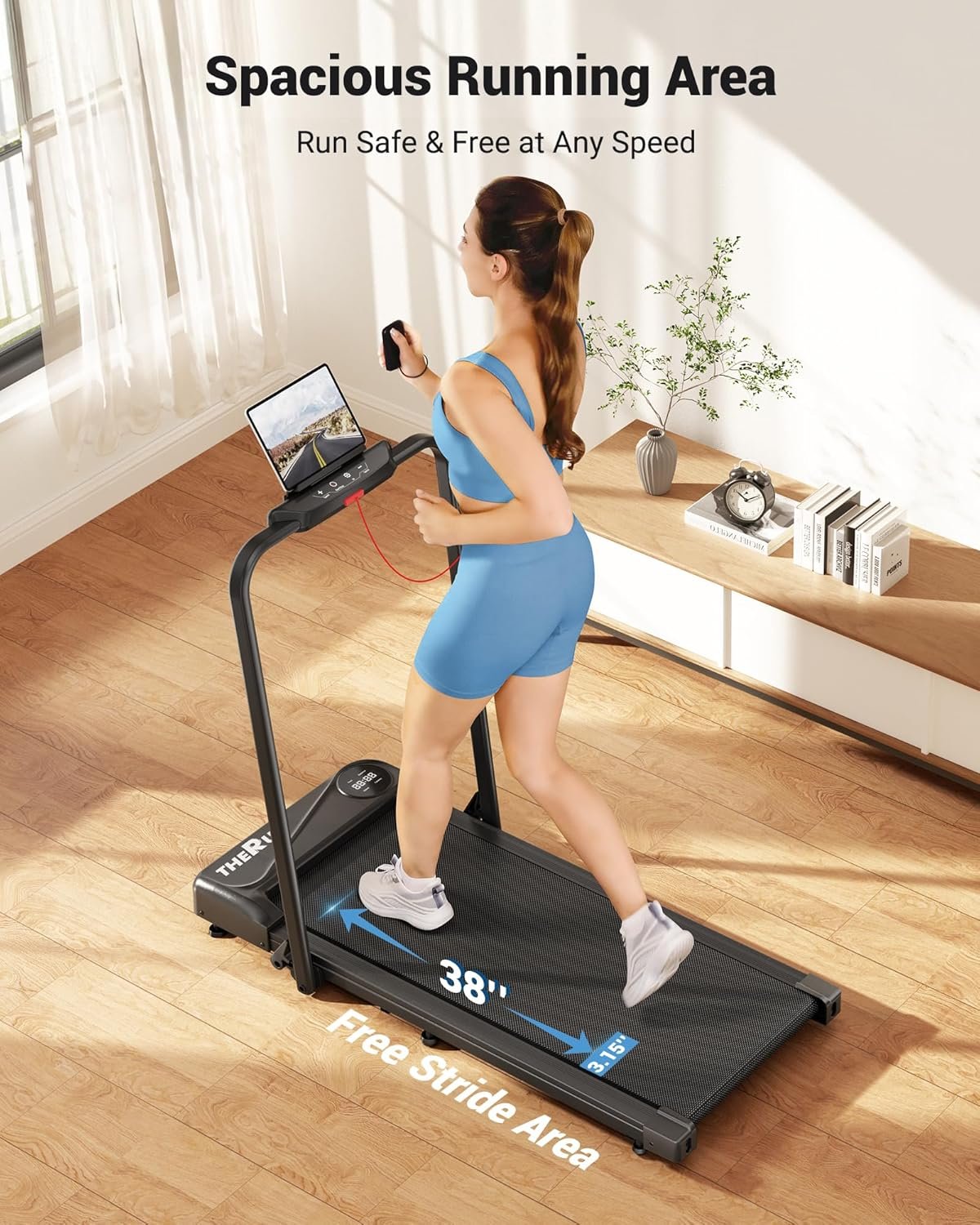 Widened 5-layer Anti-slip Running Belt: Featuring a large 38″ x 15″ non-slip rubber running belt, THERUN treadmill equipment offers a more comfortable, spacious running area, enjoy the stability of the double deck running surface, relish the comfort of low-impact training, you can enjoy running or walking at home even during rainy days, hot summers or chilly winters