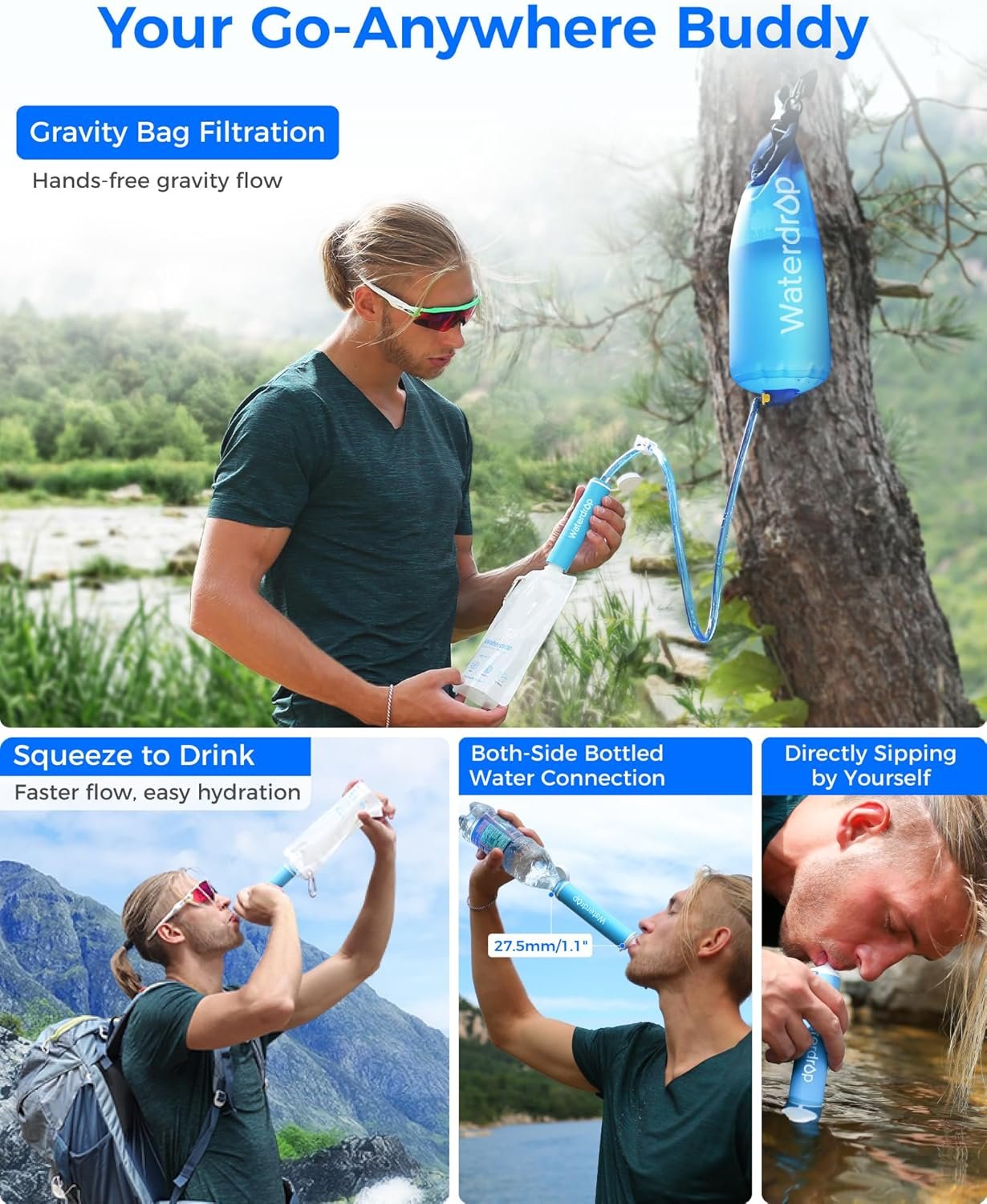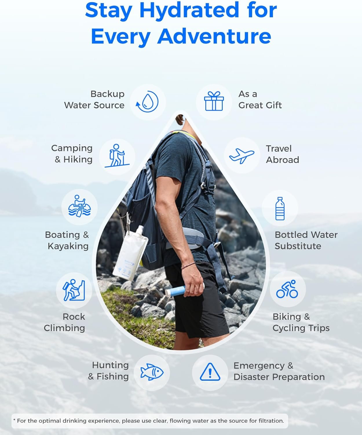 Multi-scene Application: As a necessity for outdoor water purification, the Waterdrop Gravity Water Filter Straw is applicable to hiking, camping, domestic and international travel, emergency preparedness (tornadoes, rainstorms, earthquakes, floods, etc.) to meet the emergency water demand in a variety of situations.