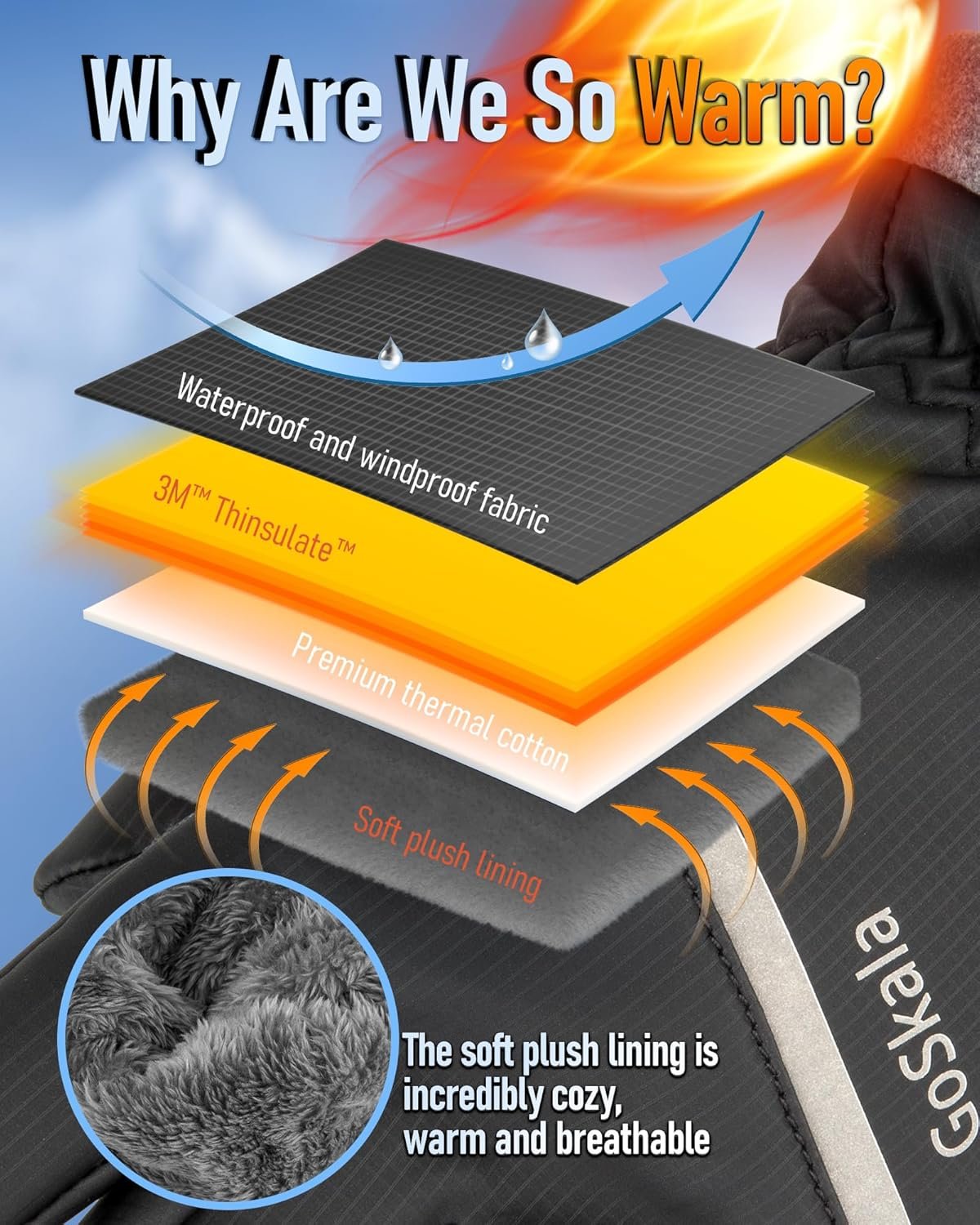The GoSkala Winter Gloves are everything I hoped for and more. I’ve used them for running, biking, and even shoveling snow, and they’ve held up beautifully. They’re warm, windproof, and waterproof, which is perfect for the unpredictable cold weather here. The touchscreen feature works surprisingly well—I can use my phone without taking them off, which is a huge plus.They fit snugly without being tight, and the grip is great for driving or holding handlebars. Whether I’m out hiking or just walking the dog, my hands stay warm and dry. The black design is sleek and goes with everything, and they feel durable enough to last through many winters.If you’re looking for gloves that combine comfort, function, and style, these are a fantastic choice. Highly recommend for anyone who spends time outdoors in cold weather!