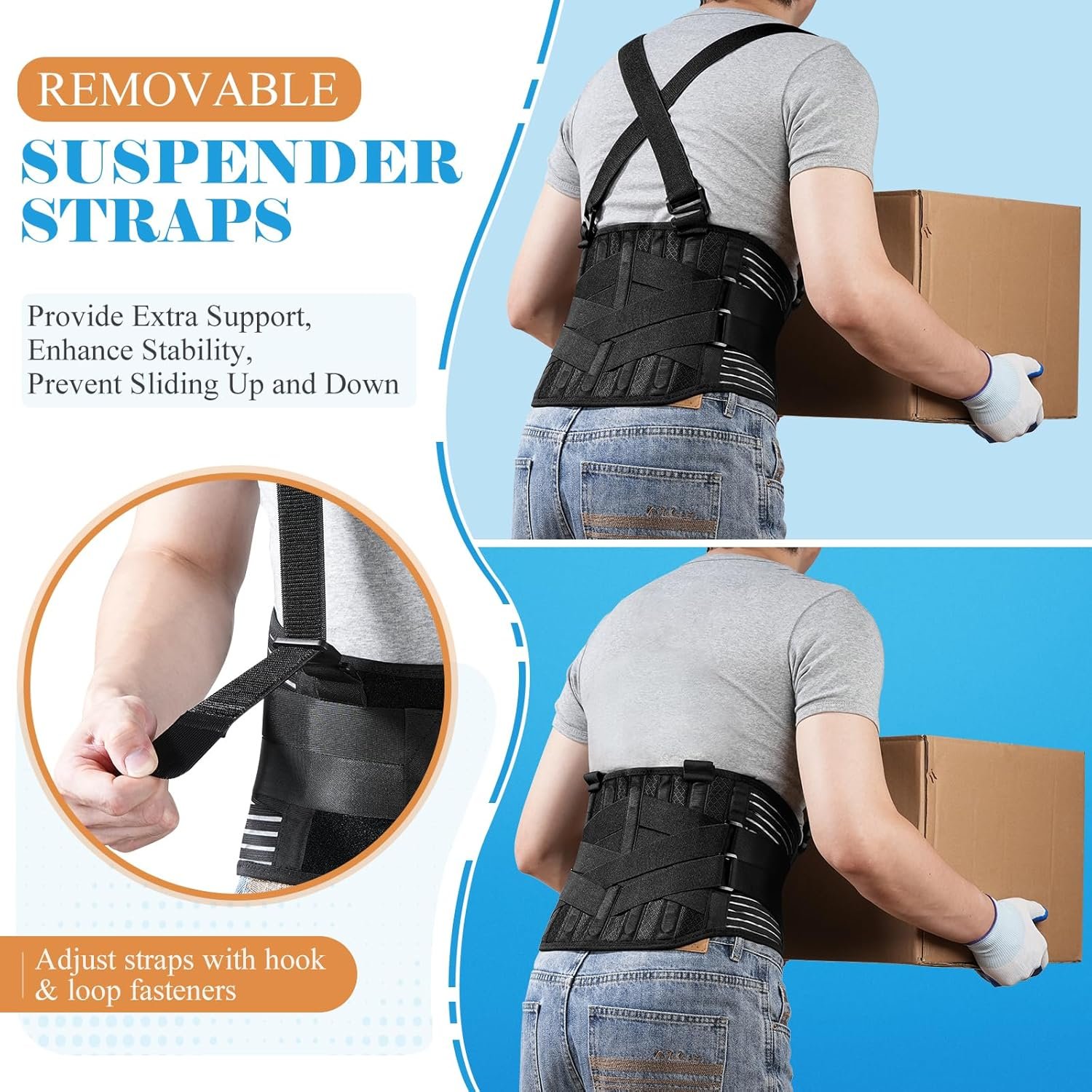 ✅【Adjustable & Removable Suspender Shoulder Straps 】- Our back support belt with 2 adjustable and removable criss-cross shoulder straps not only provide more extra support but also enhance the stability of the brace to improving back posture, effectively helping to relieve lower back pain and hold the support in place to prevent sliding up and down while working. The suspender straps can be adjusted easily, the operation is very simple and quick, which will not affect your work at all.