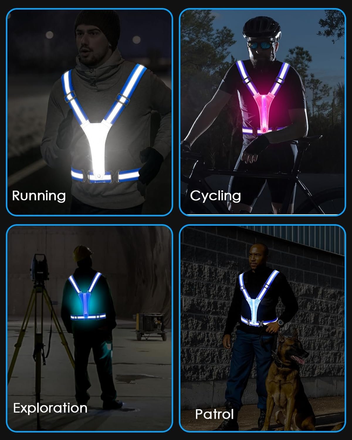 I bought this to help with my marathon training. I hate running on the treadmill, but it was hard fitting my long runs into the week without running in the dark. Before I had a small flashlight and cars could barely see me running down the road. It was very dangerous. This vest was a game changer. I was no longer worried about being seen by cars, because I lit up the road. It is super easy to use and charge. It’s not overly heavy. Its a great product for someone trying to be seen in the darkness.